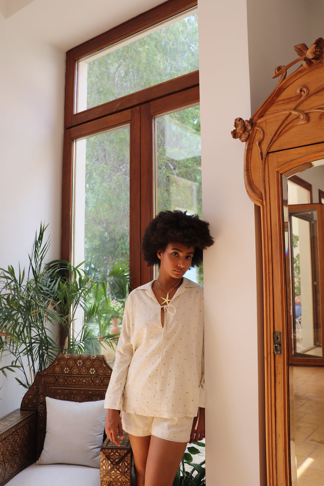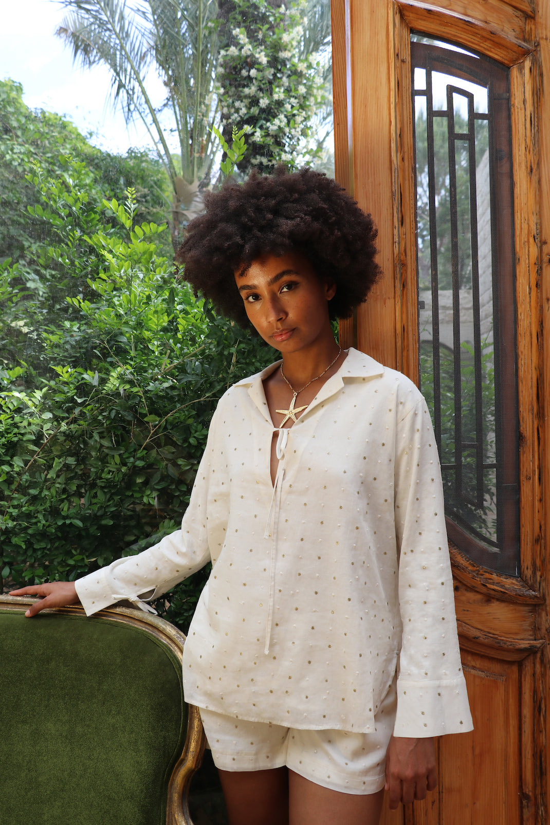 Elevate your everyday wardrobe with this stunning white cotton set, where timeless elegance meets modern comfort. Delicate gold embroidered circles create an eye-catching focal point that effortlessly transitions from casual days to special occasions. The relaxed-fit short features two convenient pockets—because style shouldn't compromise on practicality. Crafted entirely from breathable 100% cotton, this set delivers a soft, luxurious feel against your skin while keeping you cool and comfortable all day long.